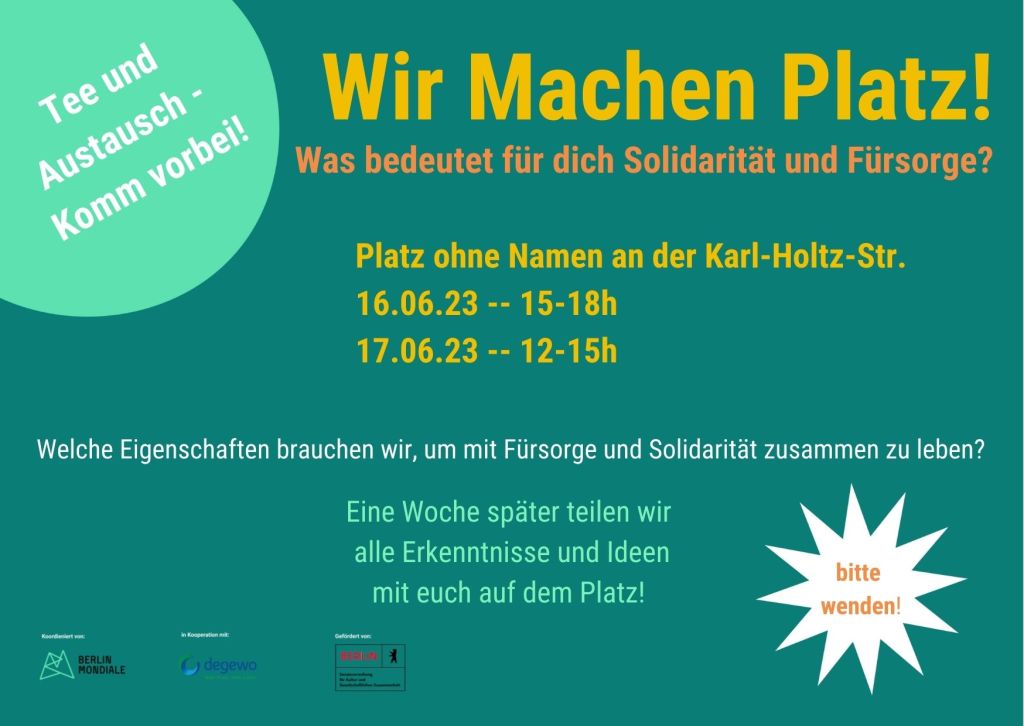 Das Projekt Wir Machen Platz! wird ermöglicht durch Berlin Mondiale, ein Projekt des Kulturnetzwerk Neukölln in Kooperation mit Degewo, gefördert von der Senatsverwaltung für Kultur und gesellschaftlichen Zusammenhalt.